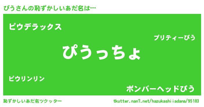 ぴうさんの恥ずかしいあだ名は… 『ぴうっちょ』『ピウデラックス』『ボンバーヘッドぴう』 ツクッター #恥ずかしいあだ名ツクッター http://tkutter.nan7.net/hazukashiiadana/95183/