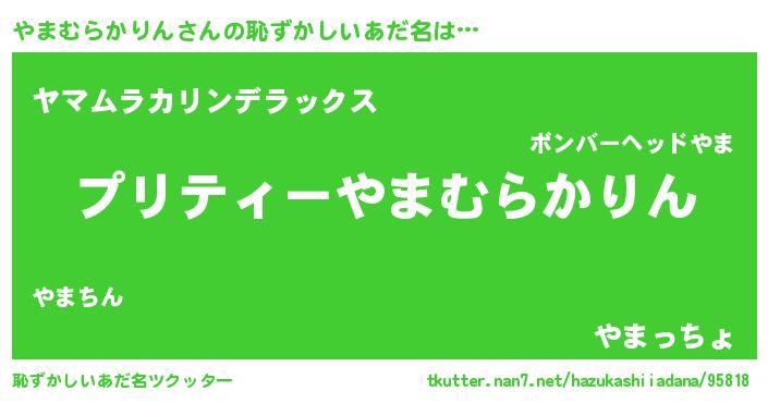 | 男性向けラノベタイトル風あだ名 | 『やまむらかりん~年齢イコール彼女いない歴の魔法使い~』 |