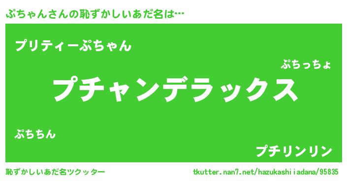 | 男性向けラノベタイトル風あだ名 | 『プチャンスレイヤー』『ぷちゃんの憂鬱』 |