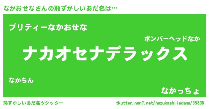| 男性向けラノベタイトル風あだ名 | 『Re:なかおせなから始める異世界生活』 |