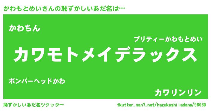 | ヘコむあだ名 | 『かわもとめい(爆)』『かわお』 |