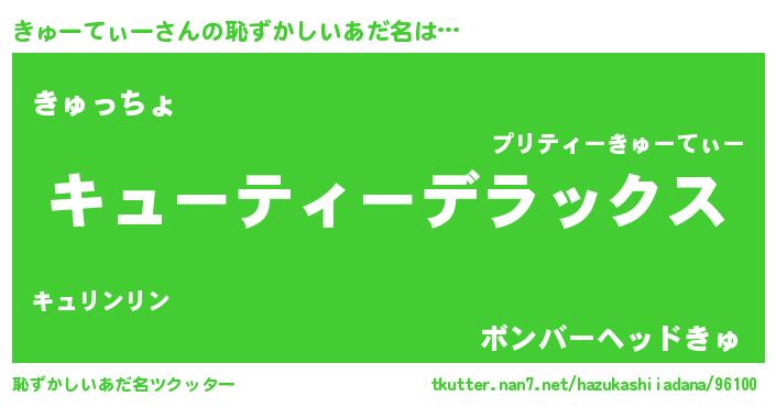 | 男性向けラノベタイトル風あだ名 | 『Re:きゅーてぃーから始める異世界生活』 |