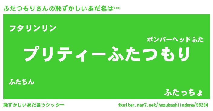 | 男性向けラノベタイトル風あだ名 | 『ふたつもり~年齢イコール彼女いない歴の魔法使い~』 |