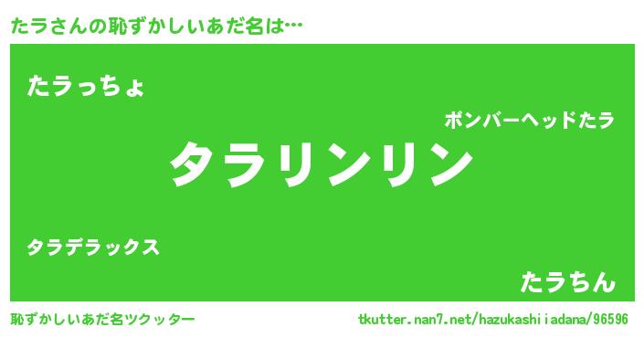 | 女子向けラノベタイトル風あだ名 | 『たラは平凡を望む』『たラ伯爵の花嫁』 |
