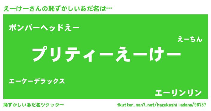 えーけーさんの恥ずかしいあだ名は… 『プリティーえーけー』『ボンバーヘッドえー』『エーリンリン』 ツクッター #恥ずかしいあだ名ツクッター http://tkutter.nan7.net/hazukashiiadana/96757/