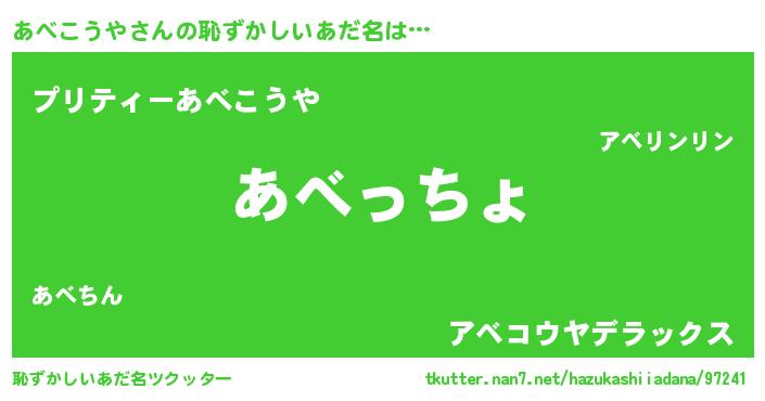 | 男性向けラノベタイトル風あだ名 | 『あべこうや~年齢イコール彼女いない歴の魔法使い~』 |