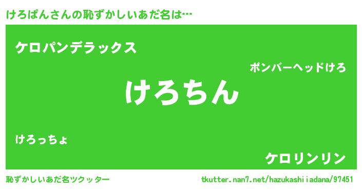 | 男性向けラノベタイトル風あだ名 | 『けろぱんという概念が存在しない退屈な世界 』 |