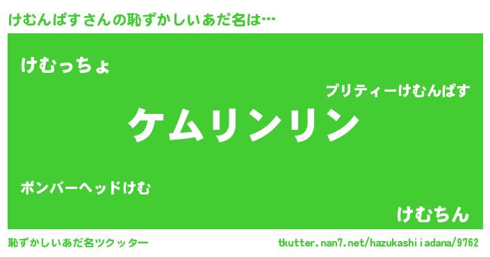 | 男性向けラノベタイトル風あだ名 | 『けむんぱすの嫁は女の子じゃないと思った?』 |