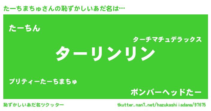 たーちまちゅさんの恥ずかしいあだ名は… 『ターリンリン』『たーちん』『ボンバーヘッドたー』 ツクッター #恥ずかしいあだ名ツクッター http://tkutter.nan7.net/hazukashiiadana/97675/