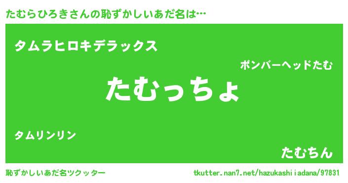 たむらひろきさんの恥ずかしいあだ名は… 『たむっちょ』『タムラヒロキデラックス』『たむちん』 ツクッター #恥ずかしいあだ名ツクッター http://tkutter.nan7.net/hazukashiiadana/97831/