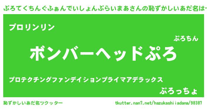 | 男性向けラノベタイトル風あだ名 | 『転生したらぷろてくちんぐふぁんでいしょんぷらいまあだった件』 |