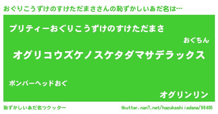 | 男性向けラノベタイトル風あだ名 | 『おぐりこうずけのすけただまさ~年齢イコール彼女いない歴の魔法使い~』 |