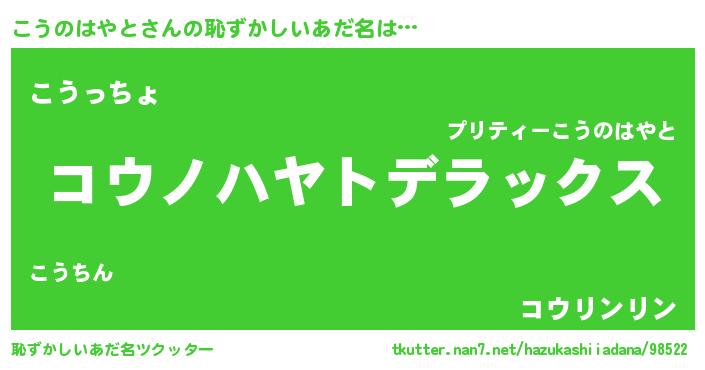 | 男性向けラノベタイトル風あだ名 | 『この素晴らしい世界にこうのはやとを!』 |