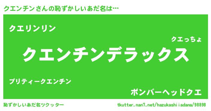 | 男性向けラノベタイトル風あだ名 | 『Re:クエンチンから始める異世界生活』 |