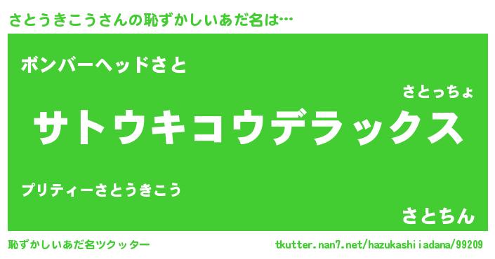 | 男性向けラノベタイトル風あだ名 | 『Re:さとうきこうから始める異世界生活』 |