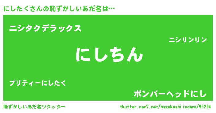 | 胡散臭い通販商品みたいなあだ名 | 『来世でも幸せになれる水素水…その名も「にしたく」』 |