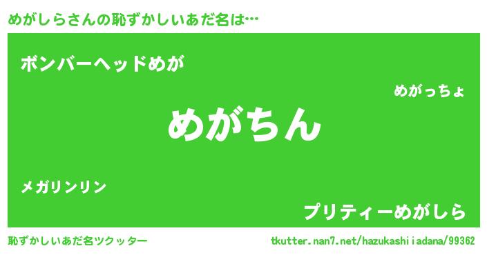 | 意味不明あだ名 | 『永久保存めがしら』『ペロリンめがしら』 |