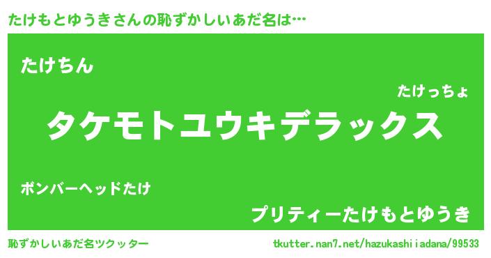 | ヘコむあだ名 | 『たけもとゆうき(笑)』『たけふぇ~』 |