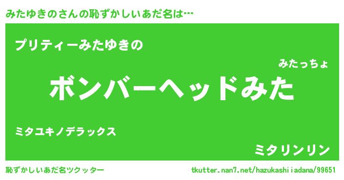 | 男性向けラノベタイトル風あだ名 | 『おまえをオタクにしてやるから、俺をみたゆきのにしてくれ! 』 |