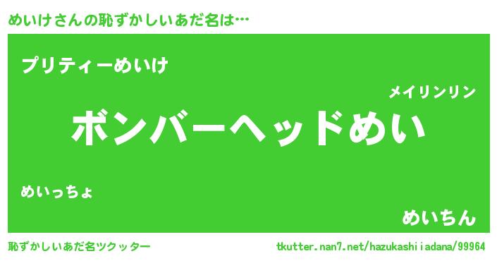 | 男性向けラノベタイトル風あだ名 | 『緋弾のメイケ』『めいけの憂鬱』 |