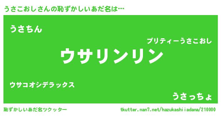 | ヘコむあだ名 | 『うさぷりん』『うさこおし(小並感)』 |