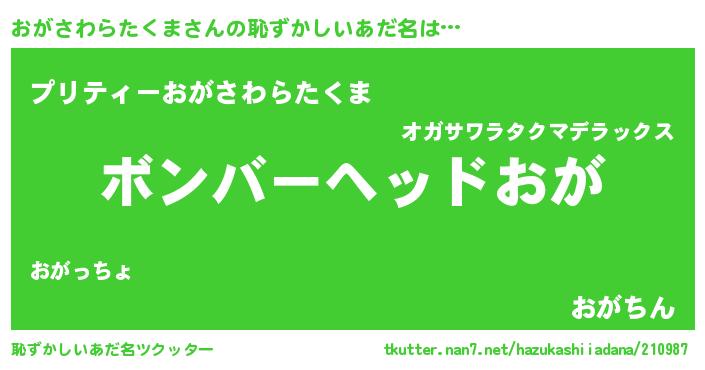 | ヘコむあだ名 | 『おがにゅー』『おがさわらたくま(震え声)』 |