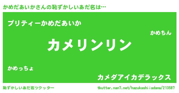 | 男性向けラノベタイトル風あだ名 | 『かめだあいかの嫁は女の子じゃないと思った?』 |