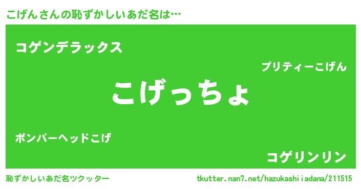 こげんさんの恥ずかしいあだ名は… 『こげっちょ』『コゲンデラックス』『コゲリンリン』 ツクッター #恥ずかしいあだ名ツクッター http://tkutter.nan7.net/hazukashiiadana/211515/