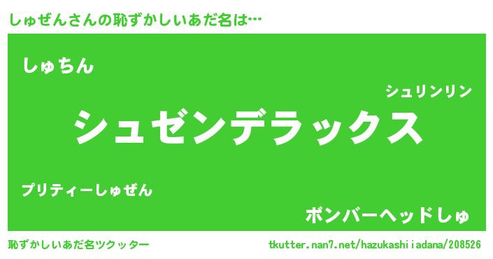 | 意味不明あだ名 | 『自称しゅぜん』『永久保存しゅぜん』 |