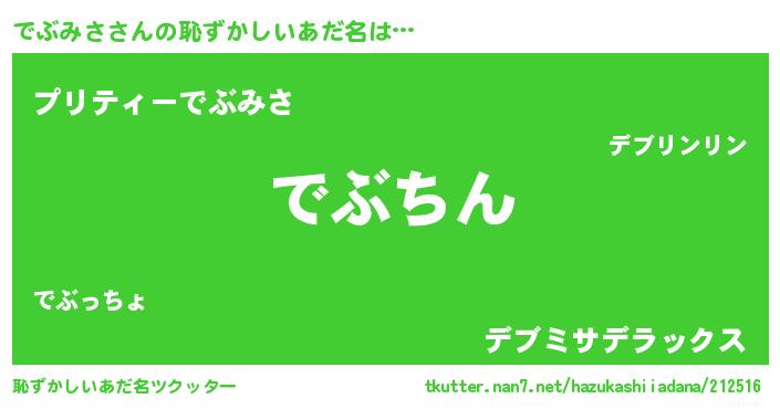 でぶみささんの恥ずかしいあだ名は… 『でぶちん』『プリティーでぶみさ』『デブミサデラックス』 ツクッター #恥ずかしいあだ名ツクッター http://tkutter.nan7.net/hazukashiiadana/212516/