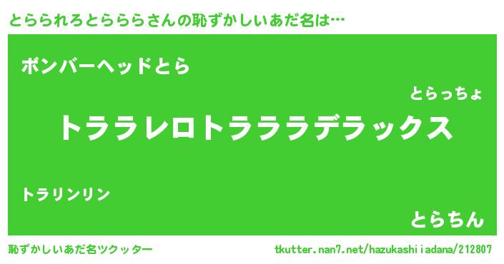 | 女子向けラノベタイトル風あだ名 | 『とらられろとらららなんてお断りですっ。』 |