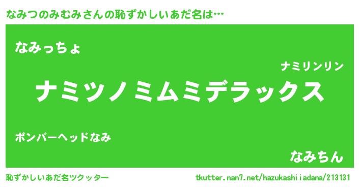 | 男性向けラノベタイトル風あだ名 | 『ナミツノミムミスレイヤー』 |