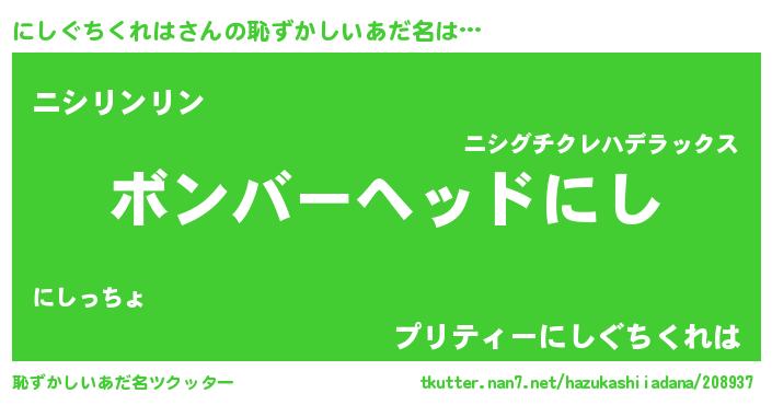 | 男性向けラノベタイトル風あだ名 | 『おまえをオタクにしてやるから、俺をにしぐちくれはにしてくれ! 』 |