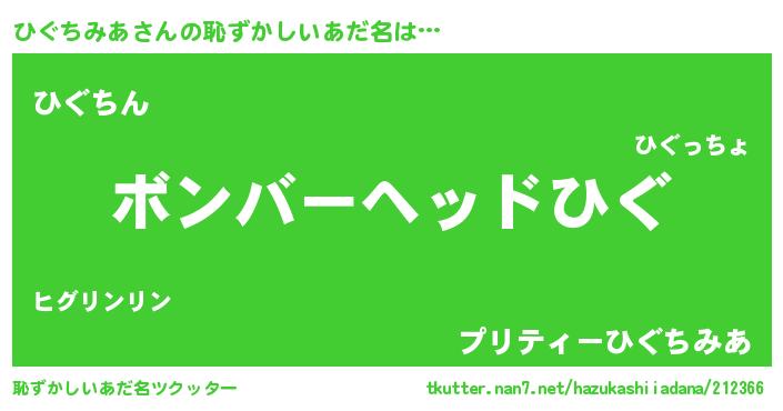 | ヘコむあだ名 | 『ひぐちみあ(笑)』『ひぐもー』 |