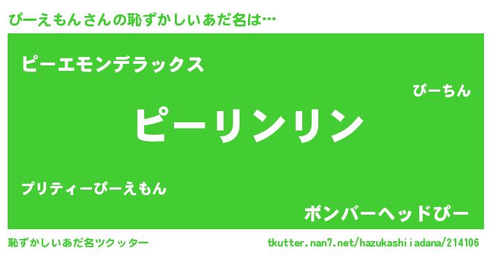 | 男性向けラノベタイトル風あだ名 | 『ぴーえもんの嫁は女の子じゃないと思った?』 |