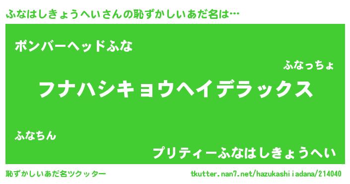 | 男性向けラノベタイトル風あだ名 | 『Re:ふなはしきょうへいから始める異世界生活』 |
