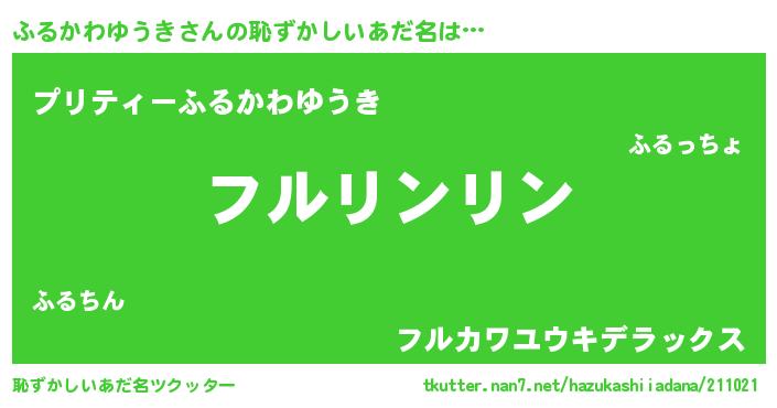 | 男性向けラノベタイトル風あだ名 | 『ふるかわゆうきの嫁は女の子じゃないと思った?』 |