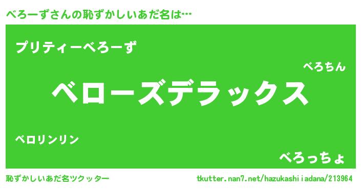 | 男性向けラノベタイトル風あだ名 | 『べろーずに滅ぼされるだけの簡単なお仕事です』 |