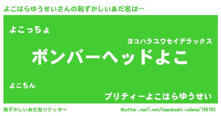 | 意味不明あだ名 | 『住所不定無職よこはらゆうせい(9歳)』 |