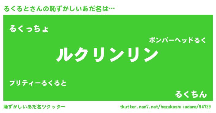 るくるとさんの恥ずかしいあだ名は… 『ルクリンリン』『るくっちょ』『るくちん』 ツクッター #恥ずかしいあだ名ツクッター http://tkutter.nan7.net/hazukashiiadana/94729/