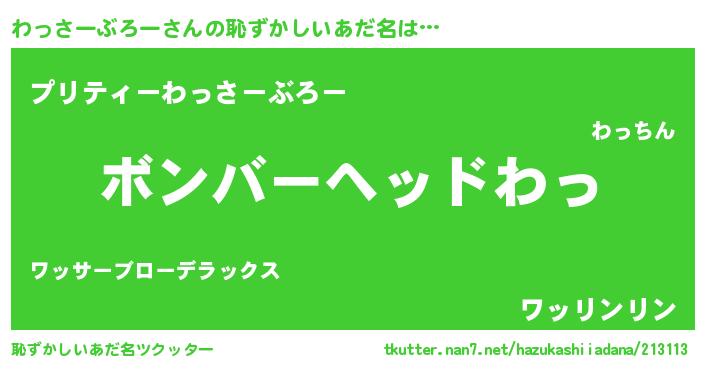 | 男性向けラノベタイトル風あだ名 | 『わっさーぶろー~年齢イコール彼女いない歴の魔法使い~』 |