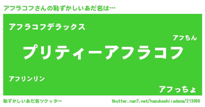 | 女子向けラノベタイトル風あだ名 | 『アフラコフの玉の輿計画!』 |