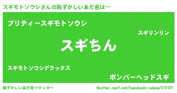 | ヘコむあだ名 | 『スギモトソウシ(苦笑)』『スギもー』 |
