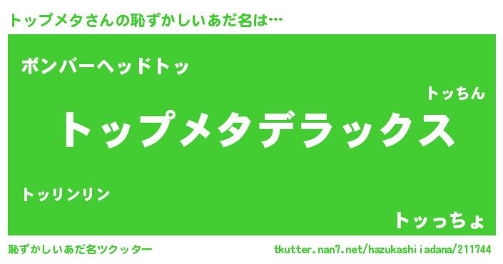 | 男性向けラノベタイトル風あだ名 | 『Re:トップメタから始める異世界生活』 |