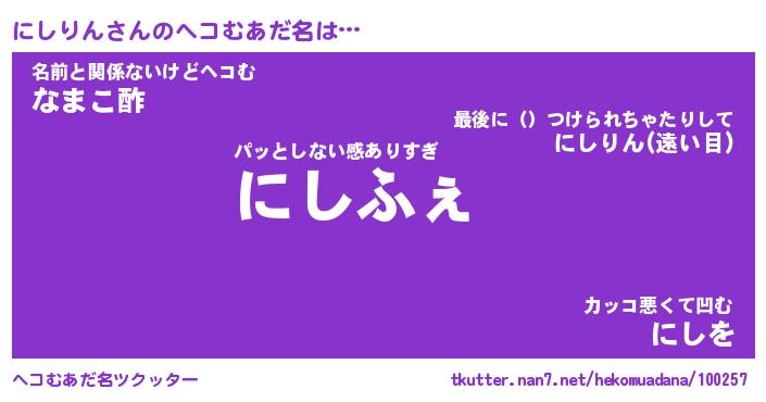 | 男性向けラノベタイトル風あだ名 | 『にしりんの憂鬱』 |