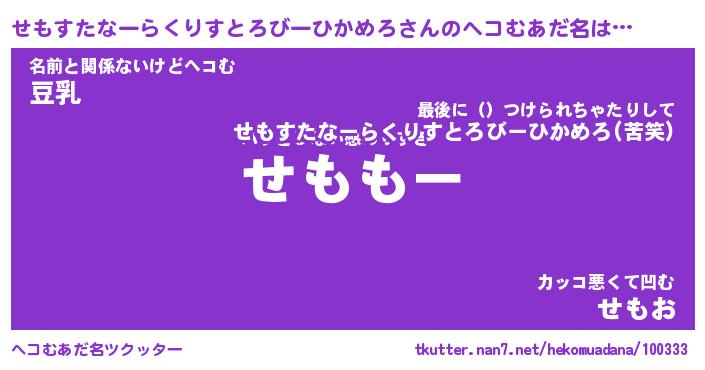 | 男性向けラノベタイトル風あだ名 | 『せもすたなーらくりすとろびーひかめろの憂鬱』 |