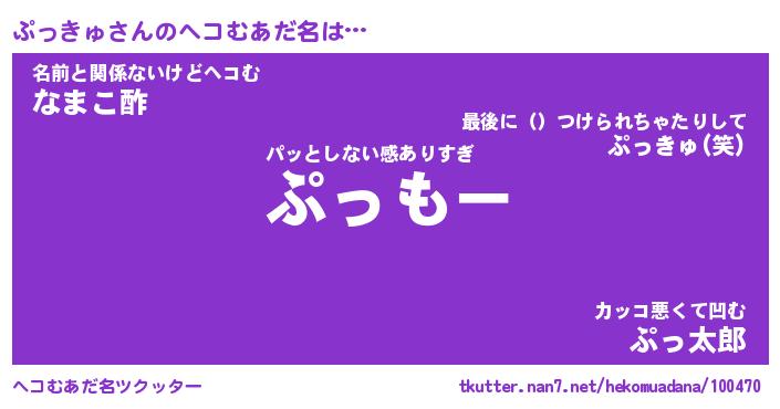 | 男性向けラノベタイトル風あだ名 | 『ぷっきゅの憂鬱』 |