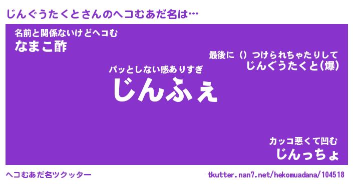 | 男性向けラノベタイトル風あだ名 | 『じんぐうたくとの憂鬱』 |