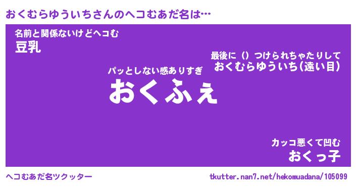 | 男性向けラノベタイトル風あだ名 | 『おくむらゆういちの憂鬱』 |