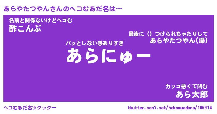 | 恥ずかしいあだ名 | 『プリティーあらやたつやん』『あらちん』 |